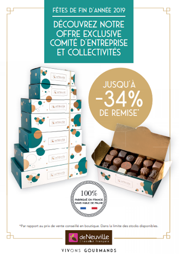 12 sept. - 31 déc. 2022[OFFRE ENTREPRISES] 📣Votre boutique de Neuville Challans a le plaisir de vous communiquer son offre Noël 2022 🥰Découvrez tout le raffinement du chocolat 100% français sans huile de Palme et laissez-vous surprendre par notre offre large et variée :° Des ballotins pour une explosion de saveurs de chocolat noir, au lait et blanc, ° Des coffrets Initiation Chocolat pour des recettes raffinées de chocolat noir et lait, ° Des étuis message pour offrir un cadeau personnalisé, ° Des coffrets à offrir pour convenir à toutes les idées cadeaux, ainsi que notre offre spécialement conçue pour les enfants et nos assortiments de colis gourmands.Une multitude de cadeaux qui sauront faire plaisir à vos collaborateurs et à leurs proches ! 😍Nous sommes à votre écoute pour vous apporter le meilleur service et vous faire partager notre passion du chocolat français !📍 Pour plus d’informations, contactez-nous au 02 51 68 52 53 ou venez nous rendre visite en boutique : 2 Rue Carnot à Challans. Ensemble, continuons à partager notre amour du chocolat français ! 💞