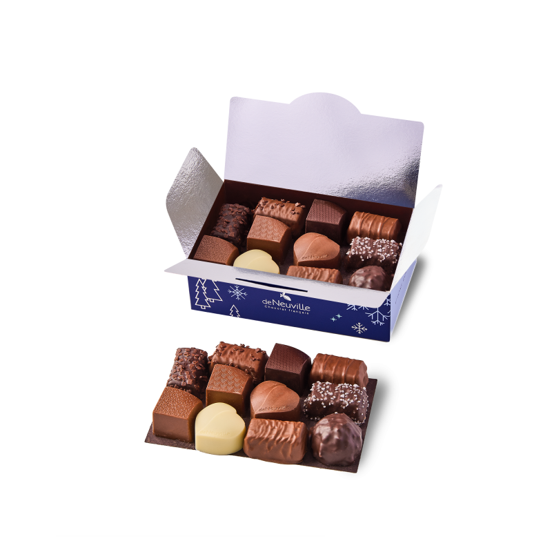 Découvrez le Ballotin Festif 220g, une invitation à la gourmandise. Composé de chocolats peu sucrés et délicieusement croustillants, il inclut des ganaches onctueuses aux parfums variés et des pralinés aux notes fruitées et touches de sel. Parfait pour la nouvelle année, il est le cadeau idéal pour partager des moments de bonheur avec vos proches. Commandez en ligne pour une livraison à domicile ou visitez nos boutiques De Neuville pour une expérience chocolatée unique. Le click&collect vous permet de choisir votre boutique préférée pour un retrait facile et rapide. Faites de ce Noël un moment inoubliable avec De Neuville. Ce ballotin est idéal pour offrir à vos clients ou collaborateurs, renforçant vos relations professionnelles avec une touche de douceur.