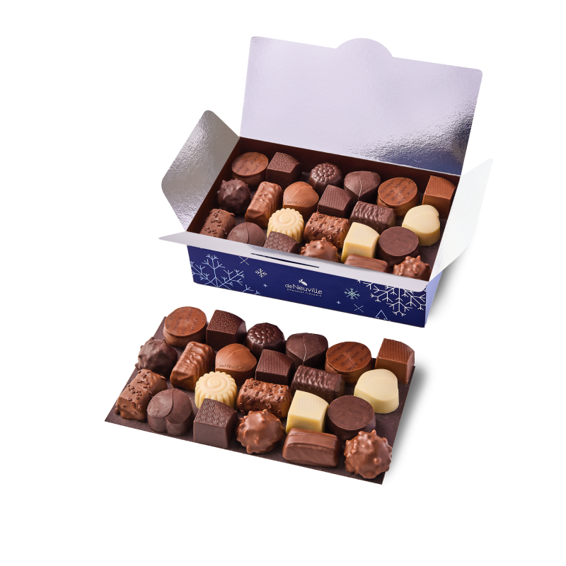 Offrez le Ballotin Festif 460g, une sélection de chocolats fins et croustillants. Chaque chocolat est une invitation à la découverte, avec des ganaches parfumées et des pralinés aux noisettes et crêpes dentelles. Parfait pour la nouvelle année, il apporte une touche de magie à vos célébrations. Commandez en ligne pour une livraison rapide ou visitez nos boutiques De Neuville pour découvrir nos spécialités. Le click&collect est également disponible pour un retrait facile et rapide. Faites de chaque instant un moment de plaisir avec De Neuville. Ce ballotin est idéal pour vos cadeaux d'entreprise, ajoutant une touche de sophistication à vos relations professionnelles.