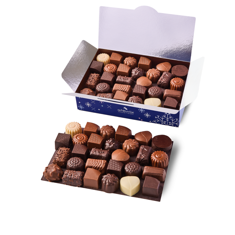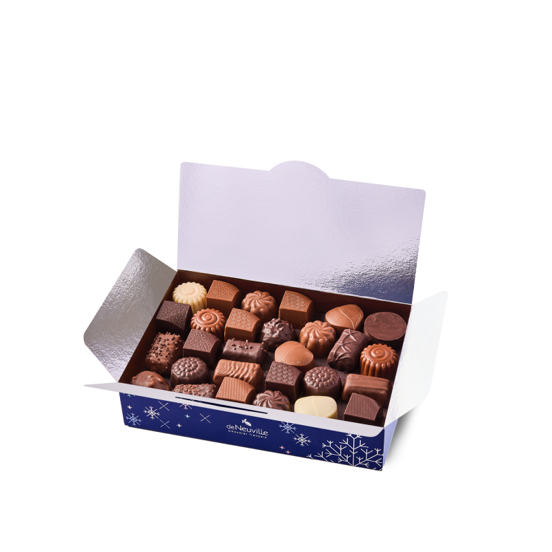 Le Ballotin de Noël 580g est le cadeau parfait pour les fêtes. Composé de chocolats d'une finesse exceptionnelle, il inclut des ganaches aux parfums variés et des pralinés aux amandes et éclats de biscuits. Idéal pour les fêtes de Noël, il transforme chaque instant en un moment de plaisir gourmand. Commandez en ligne pour une livraison à domicile ou visitez nos boutiques De Neuville pour une expérience chocolatée unique. Profitez du click&collect pour un retrait pratique et rapide, et laissez-vous séduire par l'art du chocolat français. Ce ballotin est également une excellente option pour vos cadeaux d'entreprise, apportant une touche de raffinement à vos relations professionnelles.