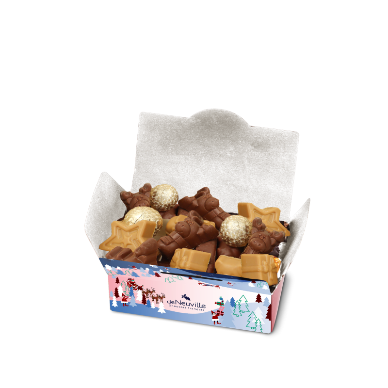 Oh oh oh, voici le ballotin qui fera briller les yeux des petits gourmands ! Spécialement conçu pour Noël avec son décor enchanté, ce petit trésor De Neuville regorge de surprises. De petits oursons en guimauve câlins, des chocolats de Noël blonds au praliné amandes et noisettes à croquer, des boules de chocolat aux saveurs mystérieuses (gianduja, ganache, praliné), et même des petits rennes au gianduja noisettes et éclats de crêpes croustillantes... le tout enrobé de chocolat noir, lait ou blanc ! Une véritable chasse au trésor gourmande pour les enfants sages. Le cadeau de Noël idéal pour faire pétiller leurs pupilles et leurs papilles. Retrouvez ce ballotin magique dans nos boutiques de chocolat De Neuville pour une livraison de chocolat pleine de surprises !