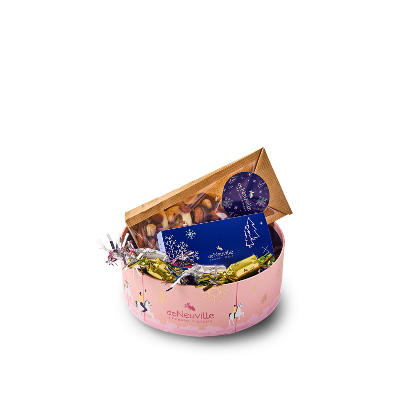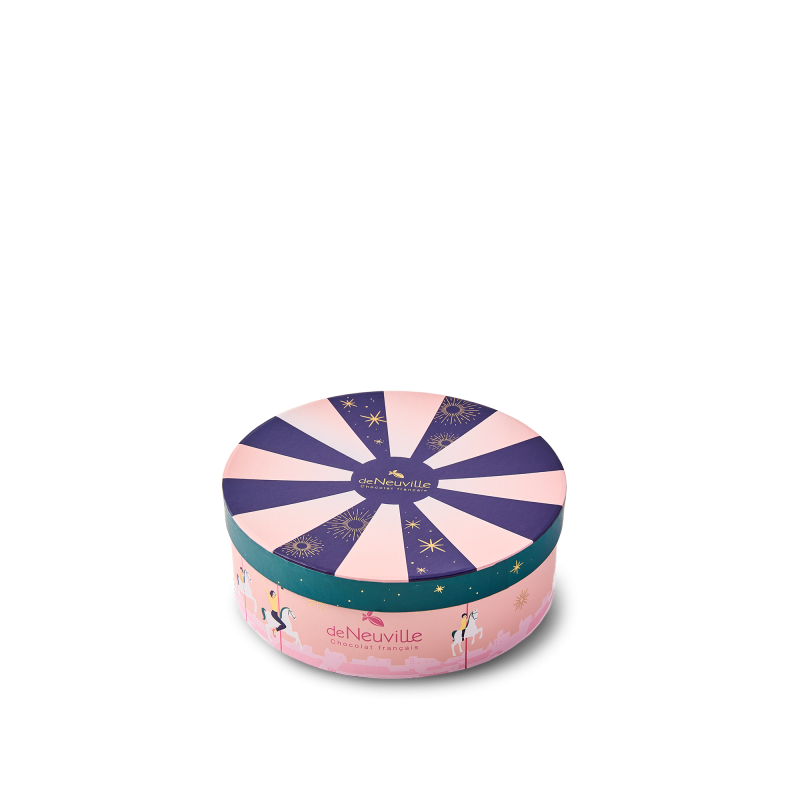 Tournez manège, les plaisirs gourmands vous attendent ! Notre Boîte Carrousel Garnie de Noël De Neuville est une véritable attraction. Elle renferme un ballotin de chocolats de 110g, un mélange de pralinés et de fines ganaches aux recettes traditionnelles ou originales, un sachet de mendiants croquants et des papillotes pleines de surprises. Le tout présenté dans une magnifique boîte en forme de carrousel, une invitation à la rêverie et à la gourmandise. Un cadeau de Noël enchanteur, idéal pour offrir du chocolat et faire voyager les papilles. Retrouvez cette merveille dans nos boutiques de chocolat !