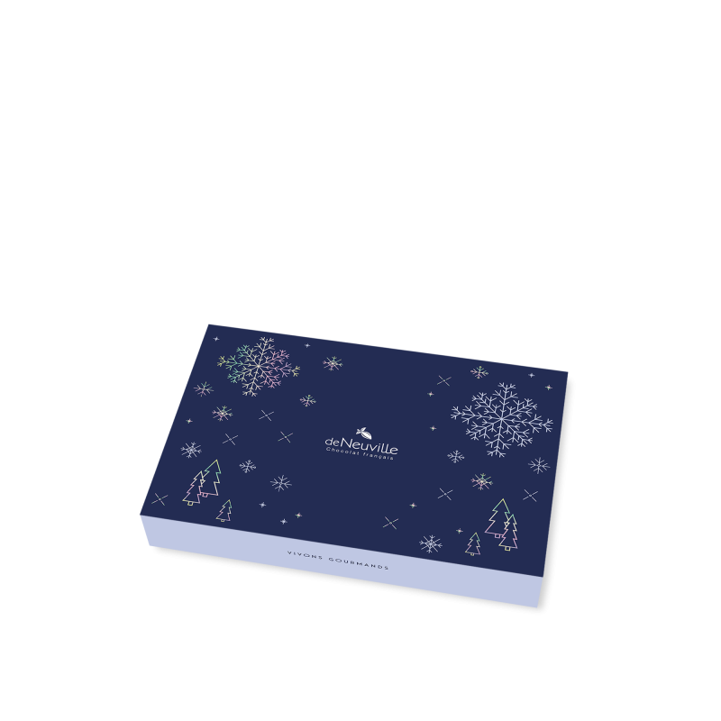Ouvrez la boîte, laissez la magie opérer ! Notre Boîte de Noël De Neuville est un concentré de délices pour les fêtes. Elle renferme une sélection exquise de nos délicats chocolats français de la gamme emblématique "Tellement Français", un véritable voyage gustatif au cœur de nos saveurs traditionnelles. Et pour parfaire le tableau, un assortiment croquant de noisettes enrobées de chocolat noir intense et de chocolat au lait onctueux. Une promesse de bonheur chocolaté, idéale pour un cadeau de Noël raffiné ou pour agrémenter vos coffrets de chocolat festifs. Retrouvez cette merveille dans nos boutiques de chocolat pour une livraison de chocolat tout en élégance !