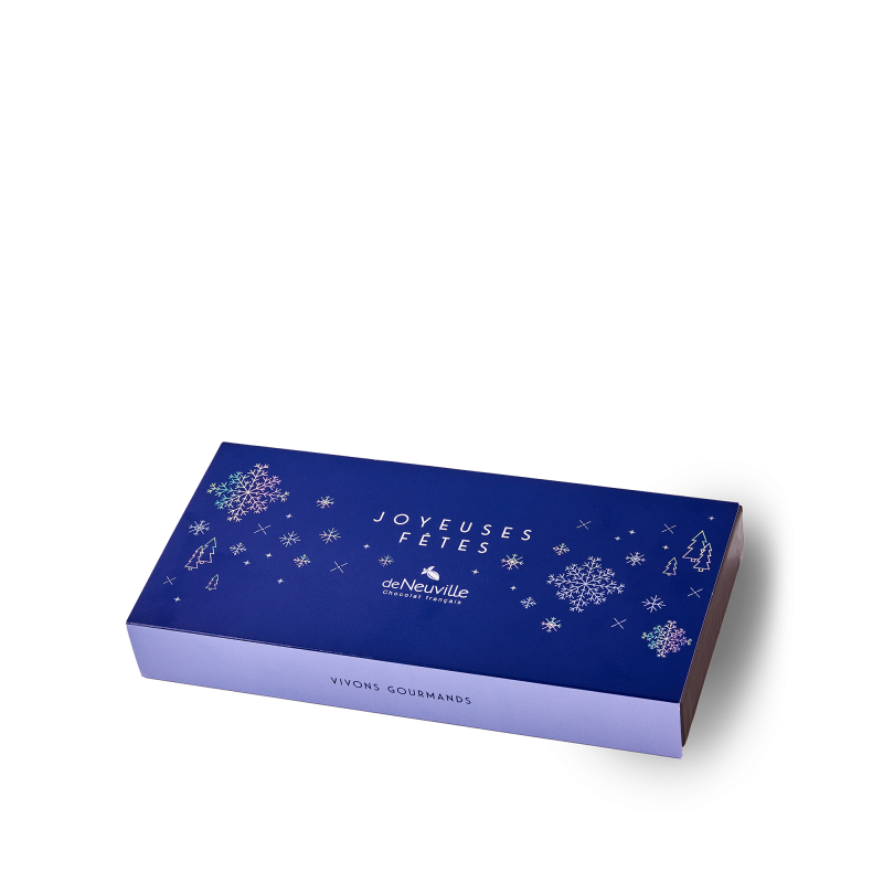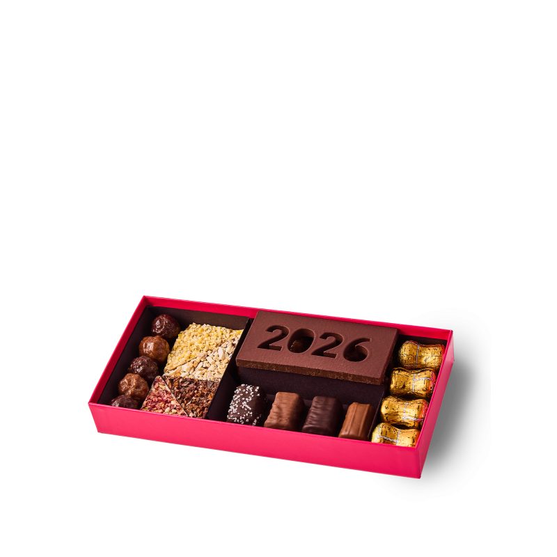 Prêt à faire sauter les bouchons (de chocolat) pour 2026 ? Notre Coffret Nouvel An 2026 De Neuville est votre passeport pour une année pleine de saveurs ! Il est composé de mini rochers au chocolat au lait et noir pour une touche croustillante, de triangles "nuances de choc" ornés de framboise, pistache, maïs et amandes/noisettes pour une explosion de couleurs et de goûts. Et la star du show : une carte en chocolat avec "2026" pour trinquer gourmand ! Sans oublier les chocolats noirs en forme de bouchons de champagne renfermant du marc de champagne. Un coffret de chocolat festif et original pour célébrer la nouvelle année avec panache. Idéal pour offrir du chocolat ou pour vos cadeaux clients de fin d'année.