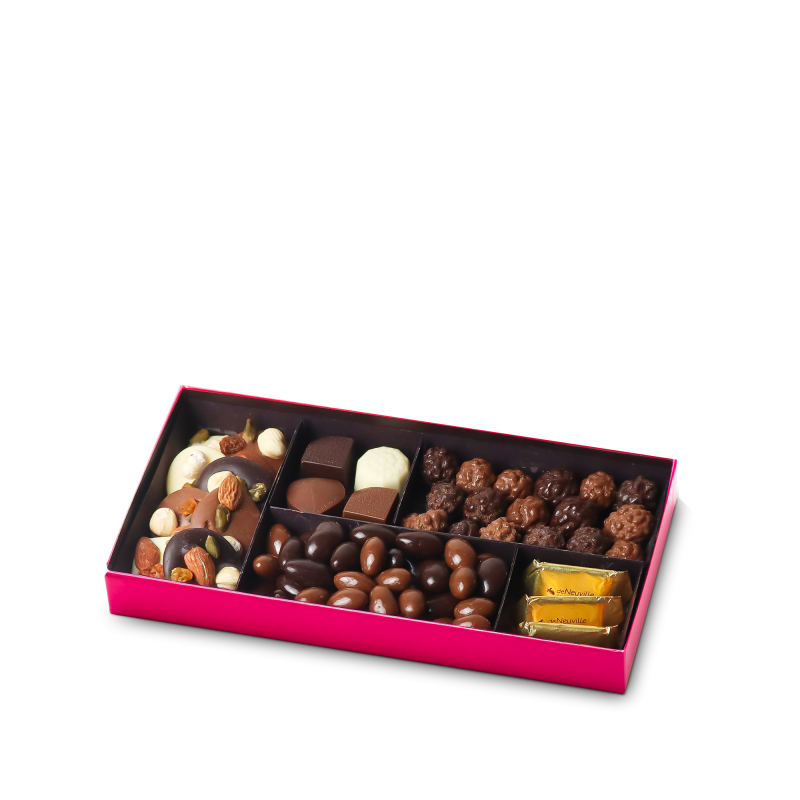 Un délicieux coffret composé d'un assortiment de chocolats, mendiants, mini rochers et amandes qui revisitent le savoir-faire à la Française à travers différentes recettes incontournables.