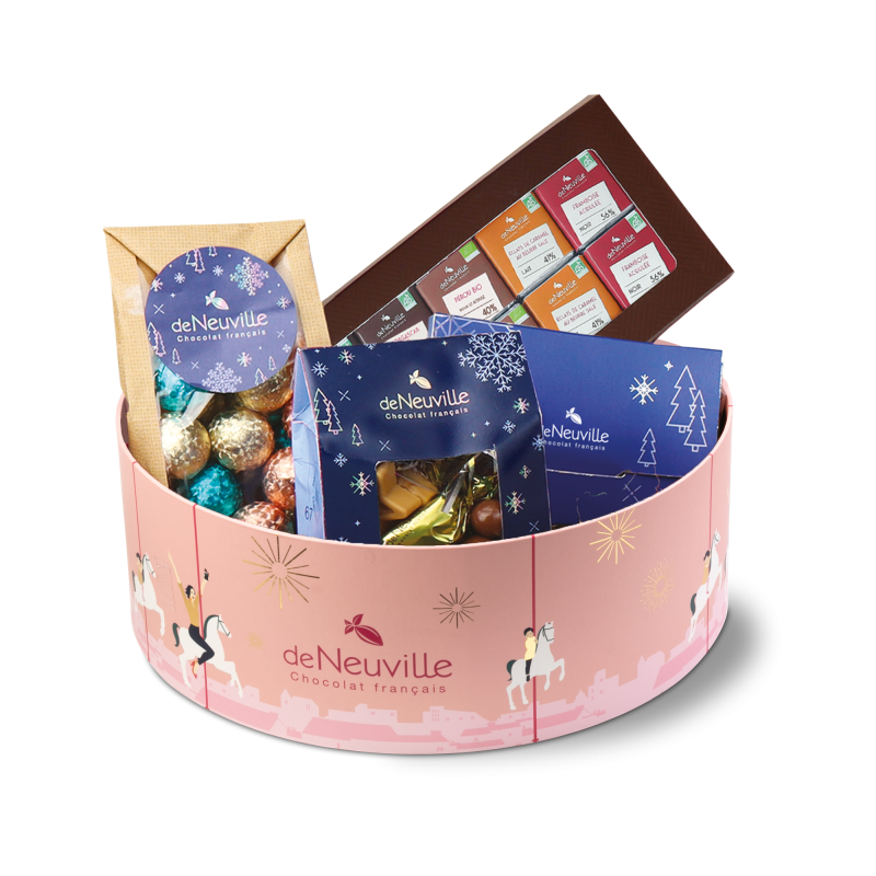 Attachez vos ceintures, le grand tour de la gourmandise commence ! Notre Grande Boîte Carrousel Garnie de Noël De Neuville est une symphonie de délices. Elle contient un ballotin de chocolats de 220g (pralinés et ganaches), un sachet de mendiants, des papillotes, un sachet de boules en chocolat, un étui de 24 carrés de chocolat et un étui de Noël garni d'un assortiment festif de papillotes, céréales croustillantes et bonbons de chocolat de Noël. Un festin royal dans une boîte carrousel majestueuse. Le cadeau de Noël ultime pour les amateurs de chocolat qui voient la vie en grand ! Parfait pour vos cadeaux clients et cadeaux salariés d'exception.