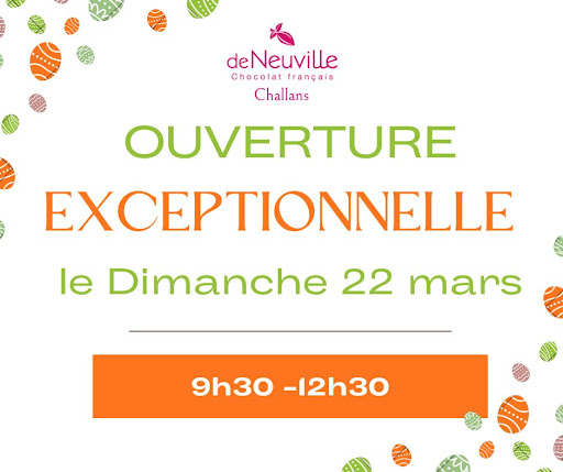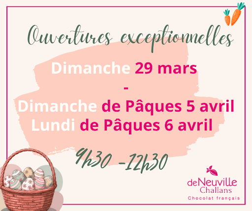 🐣✨Atelier Spécial Enfants chez de Neuville Challans ! ✨ Pâques approche, alors nous vous proposons un moment de création gourmande spécial pour votre enfant ! ➡ Crée ton plateau de chocolats de Pâques ! 🐣 📝 Sur inscription préalable 5€ /enfant 📅 Quand ? Plusieurs Dates possibles : 🔸Mercredi 02/04 🔸Lundi 07/04 🔸Mardi 08/04 🔸Mercredi 09/04 🕒À quelle heure ? Entre 15h et 17h (4 créneaux possibles) 📍 Où ? Dans notre boutique au centre-ville / 2 rue Carnot 85300 Challans 🎟️ Inscris-toi par téléphone, Facebook, Instagram ou directement en magasin ! Et en plus, pour toute inscription à l’atelier, bénéficiez de 5€ offerts par tranche de 20€ d’achats. À très vite !!