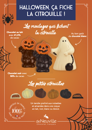 🎃 Halloween, ça fiche la citrouille ! 👻🍫La saison la plus effrayante (et la plus gourmande !) de l’année est de retour… Découvrez nos créations chocolatées aussi craquantes que terrifiantes :🍫 Les moulages qui fichent la citrouille – En chocolat noir (58 % de cacao), lait (41,5 %) ou blanc ! – Des citrouilles et fantômes trop mignons pour résister 👻🧡 Les petites citrouilles Un tendre praliné aux noisettes et amandes, enrobé d’une coque en chocolat lait, noir, blanc ou blond… un vrai sortilège de douceur !✨ 100 % fabriqué en France, sans huile de palme — et 100 % plaisir gourmand.📍 Disponibles dès maintenant en boutique… mais attention, les monstres risquent d’en croquer avant vous ! 😋