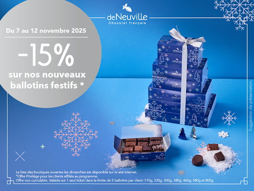 Découvrez De Neuville, votre boutique locale de chocolat français à proximité de chez vous, où l'art du chocolat est célébré avec passion. Nos chocolats raffinés, 100% fabriqués en France et sans huile de palme, sont parfaits pour les amateurs de gourmandises. Explorez notre vaste gamme de ganaches, pralinés, macarons, glaces, dragées, et spécialités régionales, tous présentés dans des compositions élégantes. Que ce soit pour offrir un cadeau mémorable ou pour vous faire plaisir, nos coffrets et bouquets sont conçus pour émerveiller. De Neuville est également votre partenaire idéal pour des solutions personnalisées dédiées aux professionnels. Venez découvrir nos délices et laissez-vous séduire par l'excellence du chocolat français.