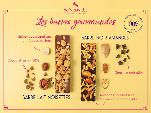 Découvrez nos barres gourmandes De Neuville, parfaites pour une pause sucrée ou un petit cadeau savoureux ! 🍫✨- Barre chocolat noir & amandes : Un mariage intense et croquant pour les amateurs de sensations fortes. 🌰 - Barre chocolat au lait & noisettes : Douceur et onctuosité pour un plaisir délicat. 🥜#deneuville #chocolat #chocolatfrançais #gourmandise #amande #noisette