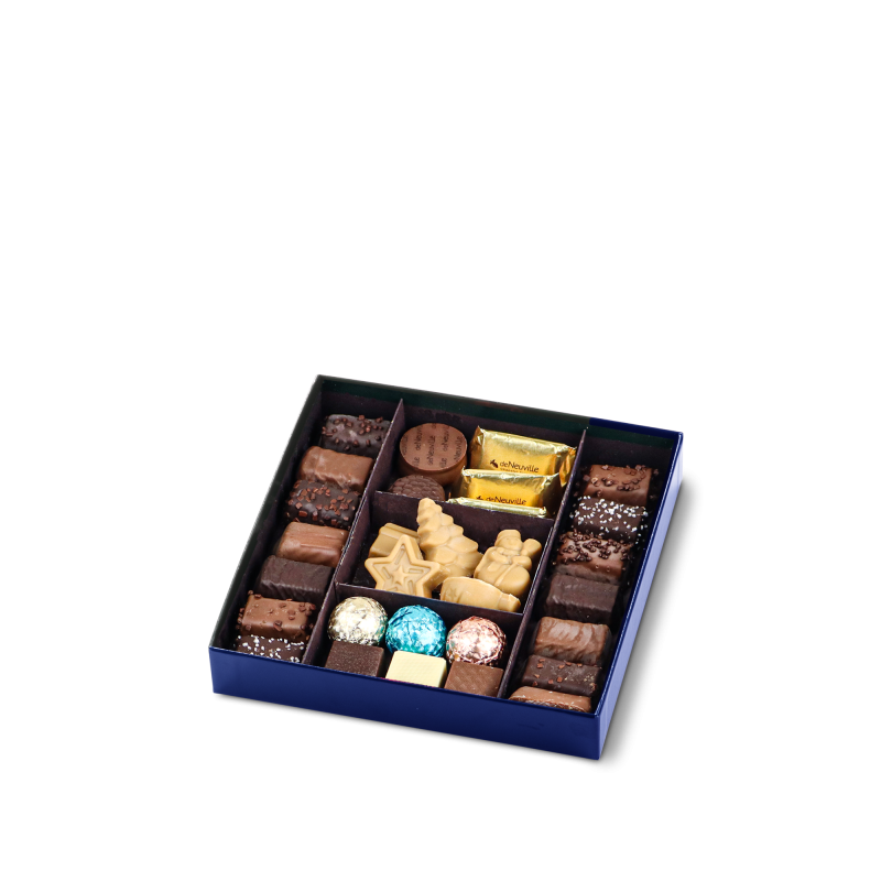 Plus grand, mais toujours aussi festif ! Notre Moyen Coffret de Chocolats Festifs De Neuville est le compagnon idéal pour célébrer un Noël gourmand. Dans son écrin aux couleurs chatoyantes des fêtes, découvrez un assortiment généreux de bonbons de chocolats (pralinés et ganaches de notre gamme "Tellement Français"), des boules en chocolat au lait et noir, des giandujas fondants et de petits chocolats blonds pour une touche d'originalité. Chaque coffret est une surprise ! Un coffret de chocolat parfait pour offrir du chocolat en grand, idéal pour vos cadeaux de Noël à destination de vos proches, clients ou salariés.