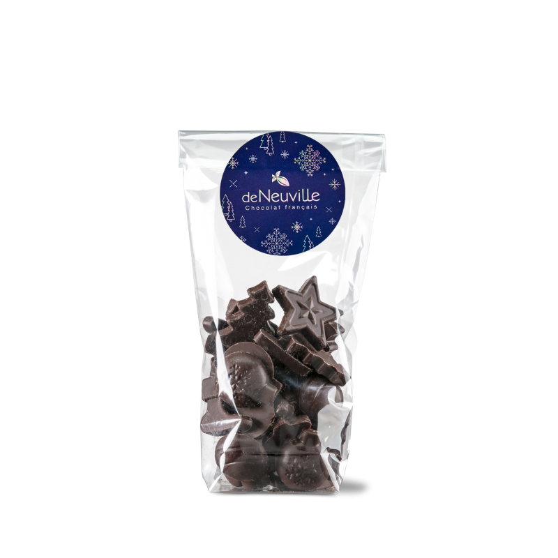 Qui a dit que la gourmandise sans sucres n'était pas magique ? Chez De Neuville, on vous prouve le contraire avec notre sachet de petits chocolats de Noël sans sucres ajoutés ! Des étoiles filantes, des sapins majestueux, des chaussettes de Noël coquines et des traîneaux enchantés, le tout sculpté dans un chocolat noir intense. Une promesse de saveurs profondes et authentiques, pour que chacun puisse profiter de la magie des fêtes sans compromis. Le chocolat français à l'état pur, pour un Noël tout en légèreté et en plaisir. Parfait pour vos cadeaux de Noël attentionnés ou pour garnir vos coffrets de chocolat personnalisés !